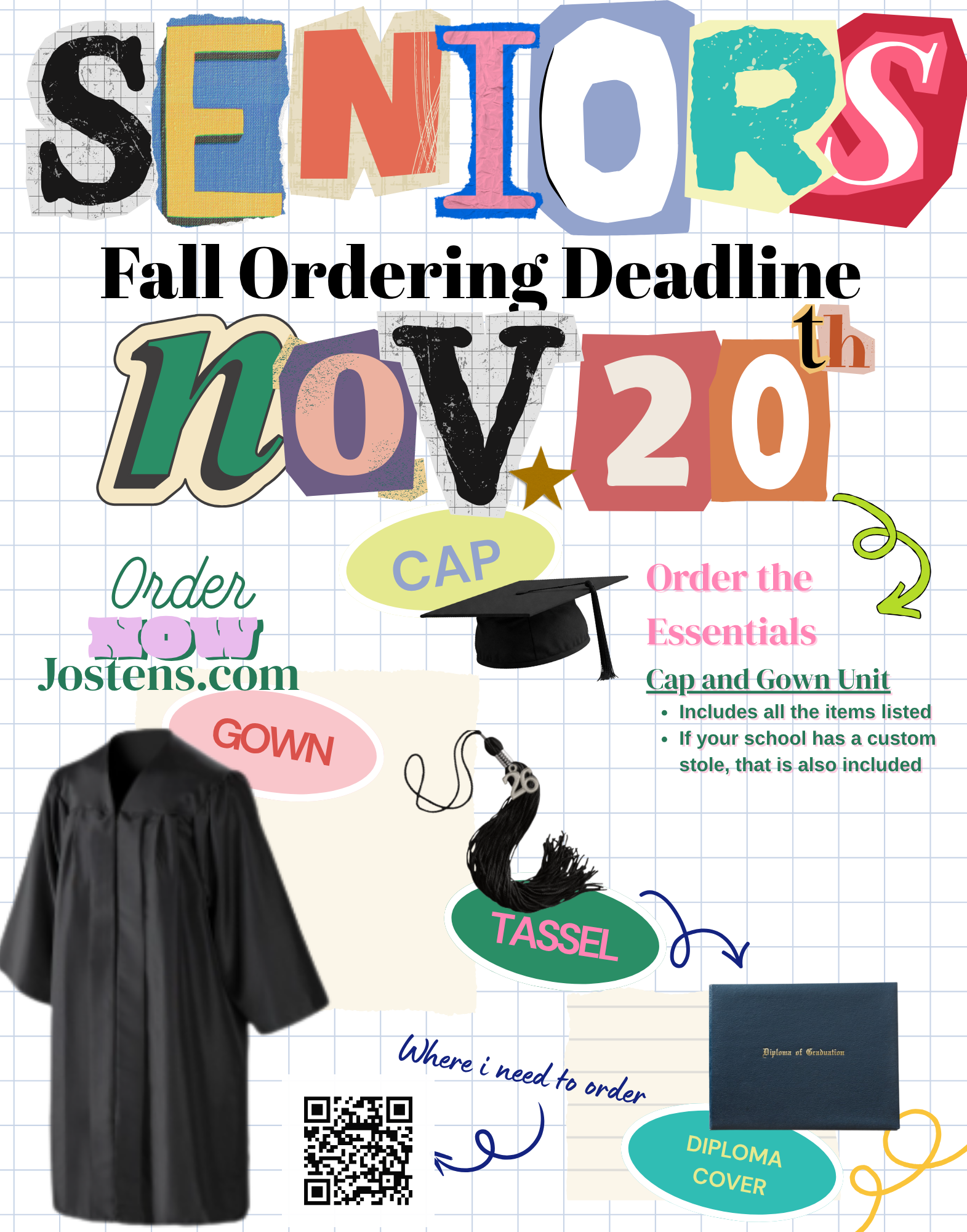 Seniors, if you have not yet ordered your Cap and Gown, please do so ASAP!! All Cap and Gown Orders must be placed by the beginning of November. After this time, the price will increase! Please check your Email or the Senior Google Classroom for more information. Email Mrs. Nunamacher at [email protected] with any questions!